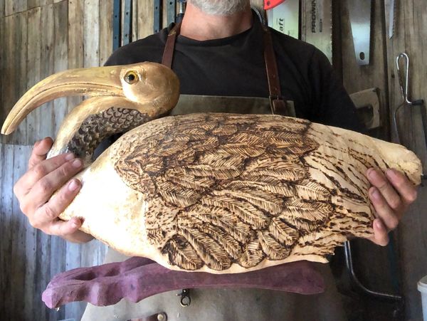 'Sacred Ibis Treasure Box' ; Wood, guilding, glass eyes, pyrography; sculpture, 2024, by artist Das Lyon.